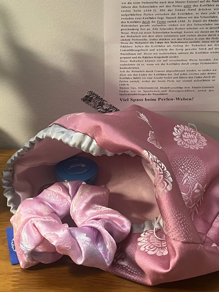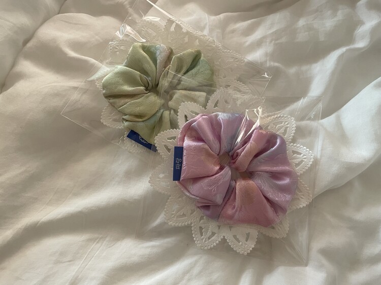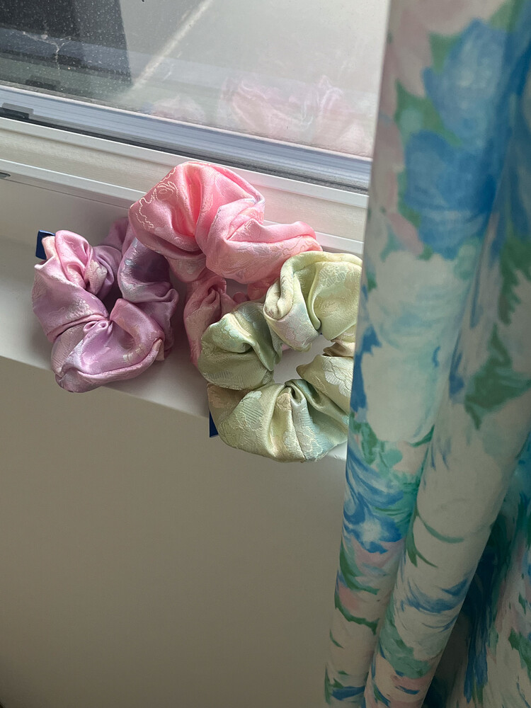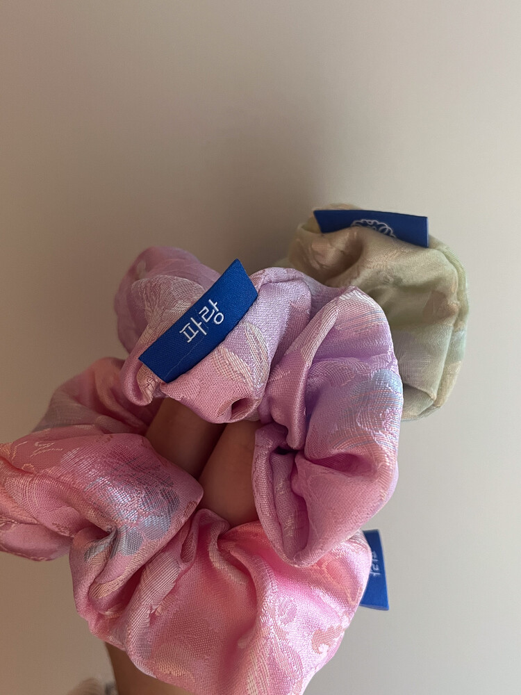 빛에 따라 영롱하게 빛나는 솜사탕 양단으로 제작된 스크런치입니다.
