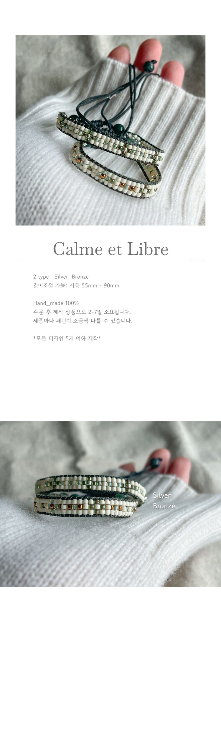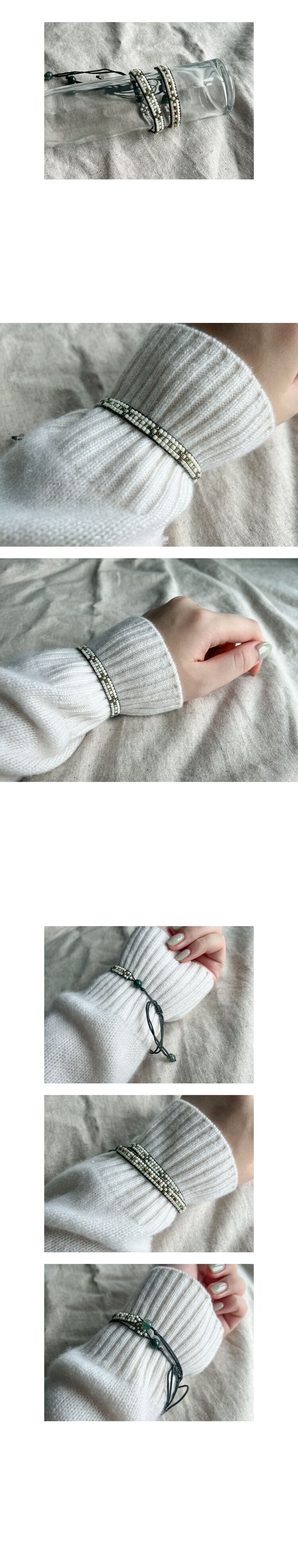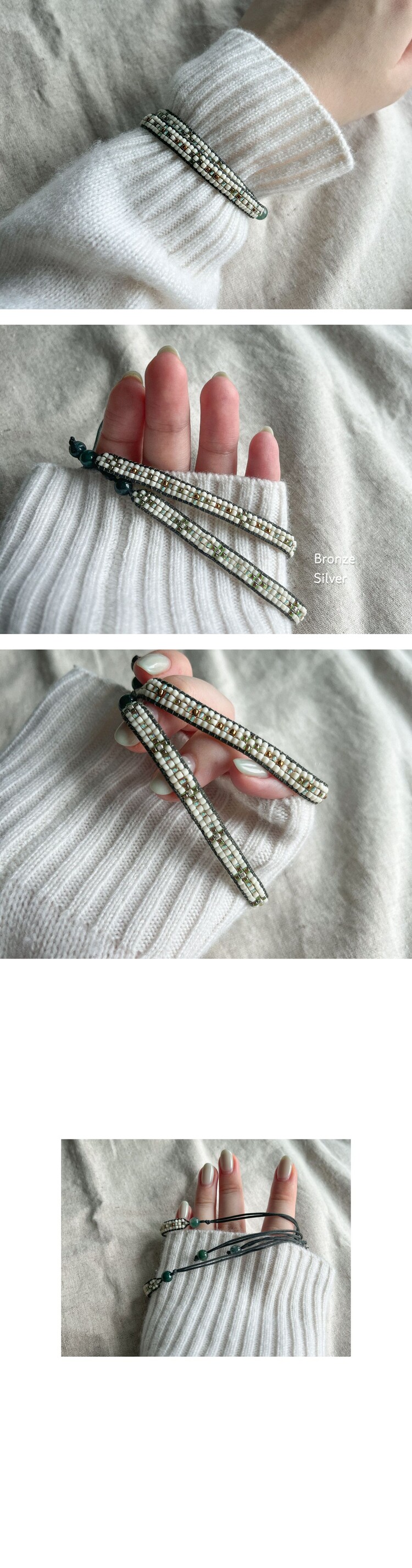팔찌를 조이고 늘리는 동작의 반복으로 비즈가 우글우글 모이는 현상이 생길 수 있습니다. 터지거나 하는 위험은 없으니 걱정 마시고 손가락으로 살살 팔찌 중앙부터 바깥쪽으로 평평하게 만져주세요.