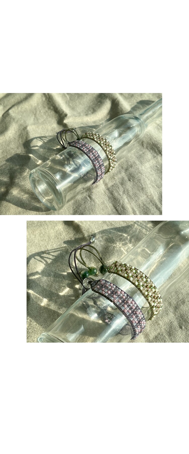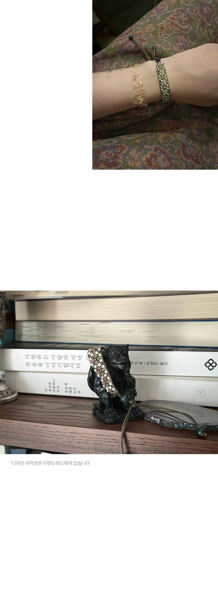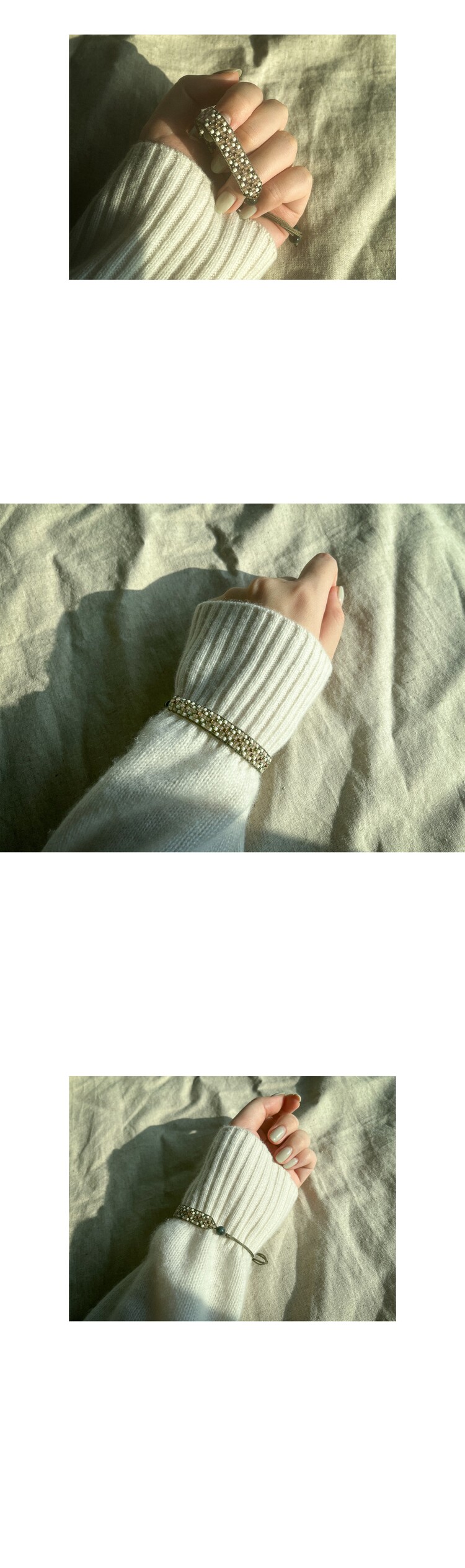 팔찌를 조이고 늘리는 동작의 반복으로 비즈가 우글우글 모이는 현상이 생길 수 있습니다. 터지거나 하는 위험은 없으니 걱정 마시고 손가락으로 살살 팔찌 중앙부터 바깥쪽으로 평평하게 만져주세요.