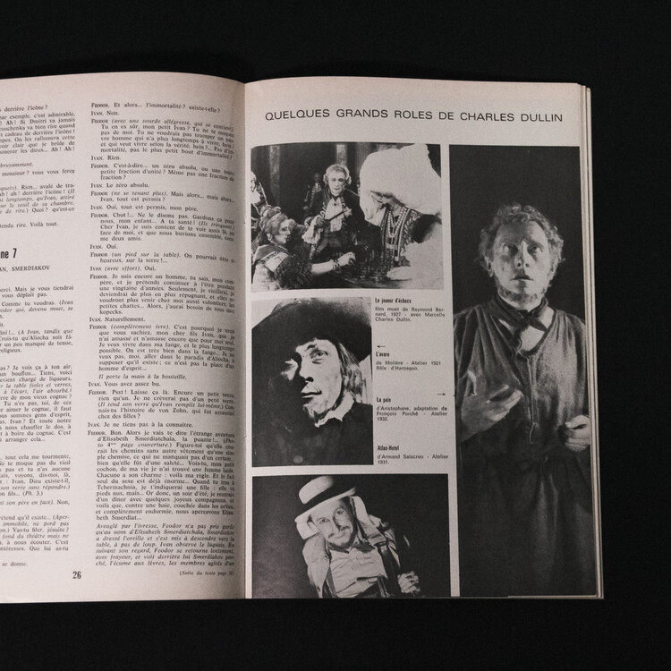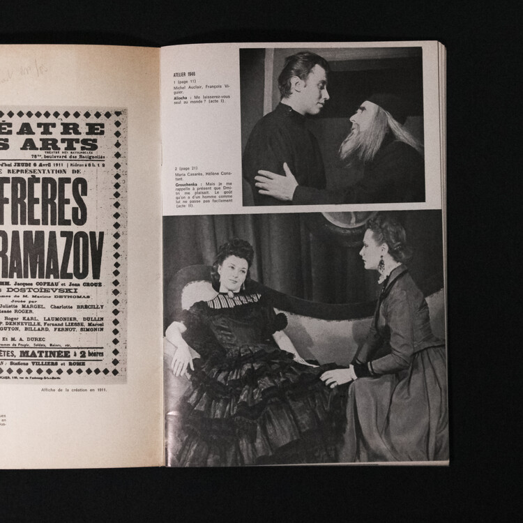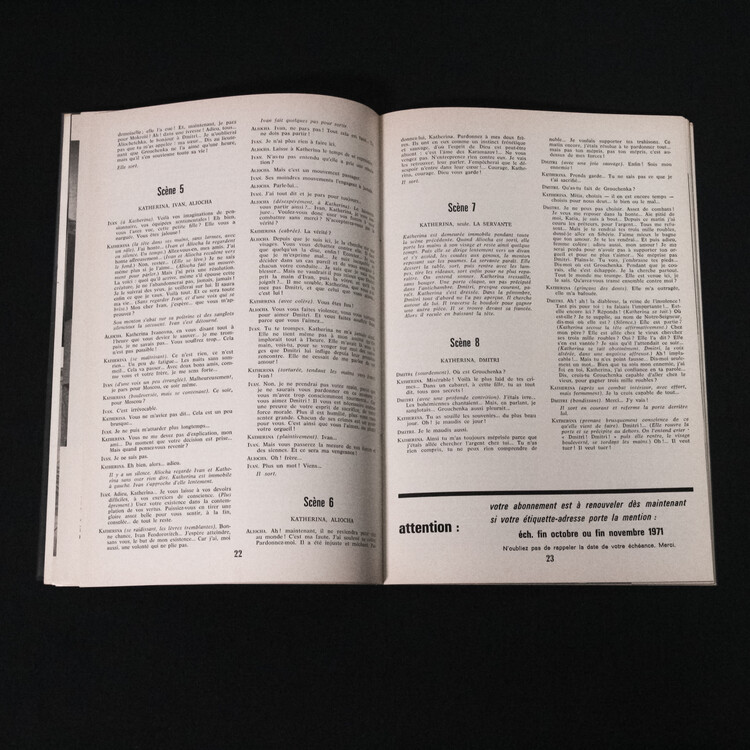 프랑스에서 발매되었던 연극 매거진입니다. 소개드리는 호에서는 도스토옙스키의 장편소설 카리마조프의 형제 (Les Frères Karamazov)에 대한 이야기가 담실려있습니다. 무대사진과 메이킹 사진등이 함께 삽입되어 있으나 대부분의 페이지는 연극의 극본으로 구성되어있습니다.