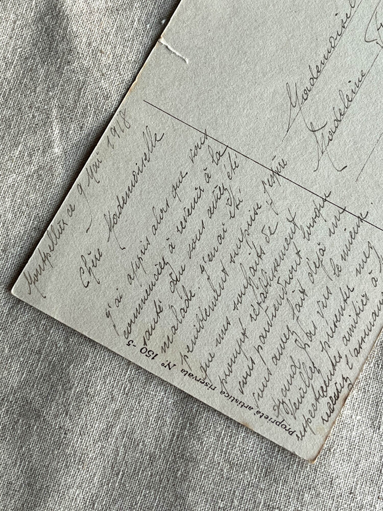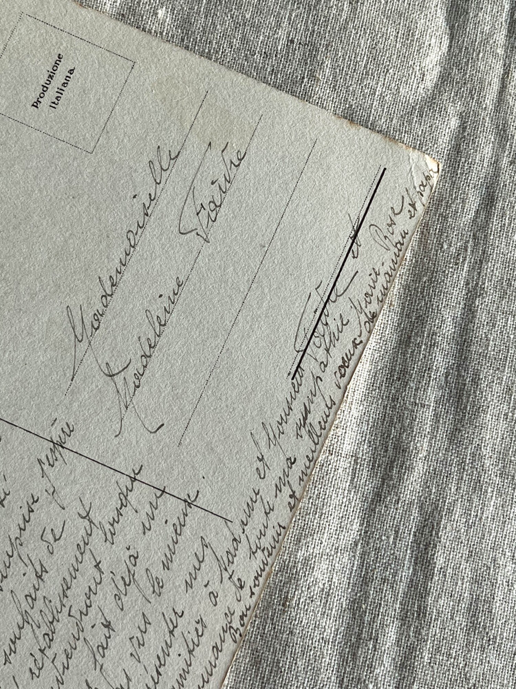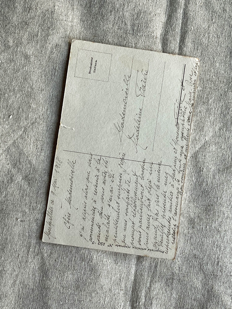 이탈리아 발행 엽서입니다. 1918년 9월 5일 날짜가 적힌 프랑스어 편지 남아있습니다. 찢긴 부분 있습니다.