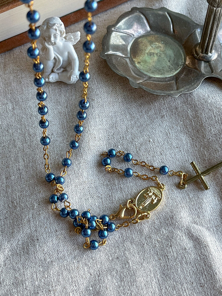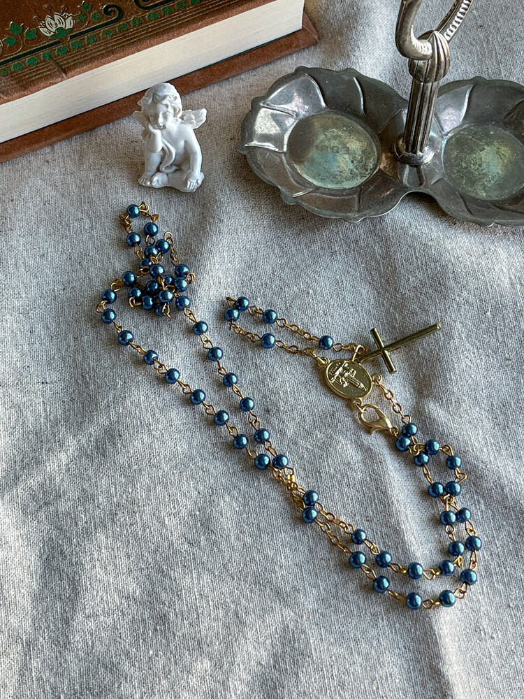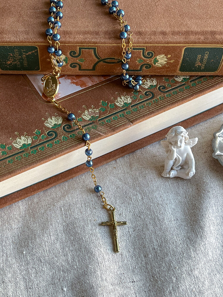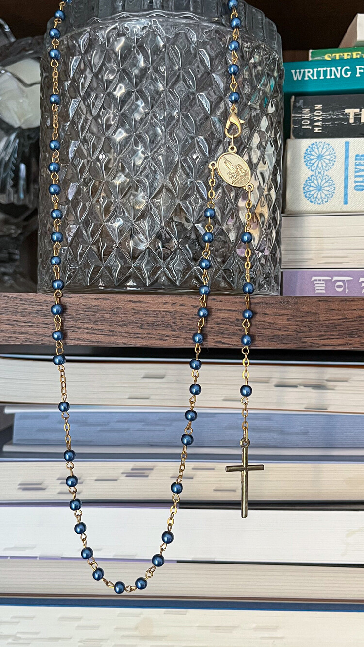 옐로우 골드 체인과 짙은 푸른빛 펄 비즈로 엮인 묵주입니다. 후크로 제작되어 목걸이처럼 착용 가능합니다.