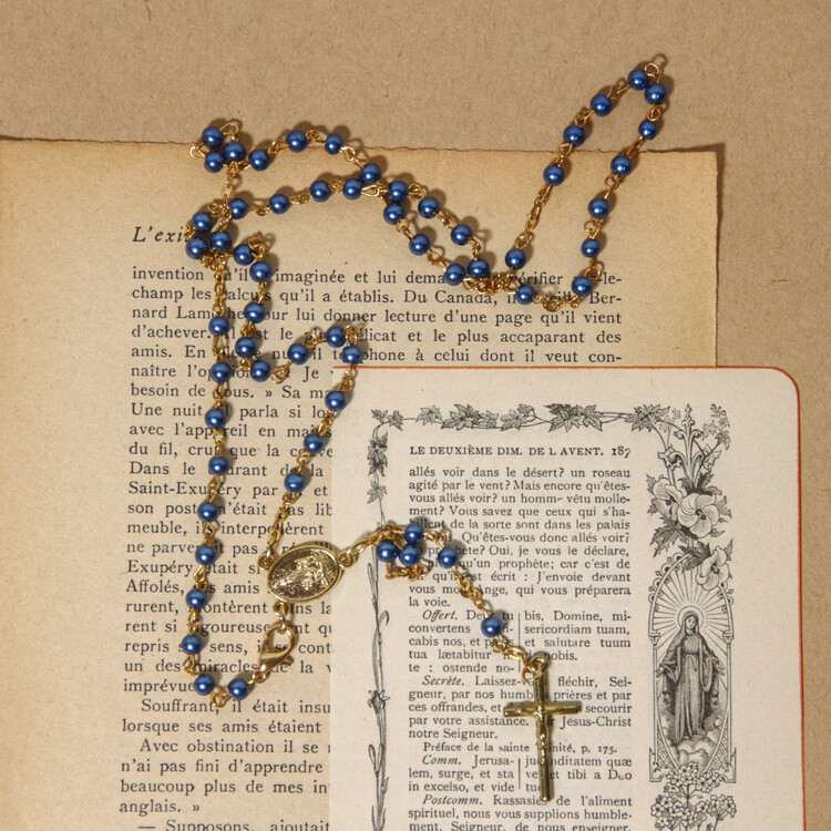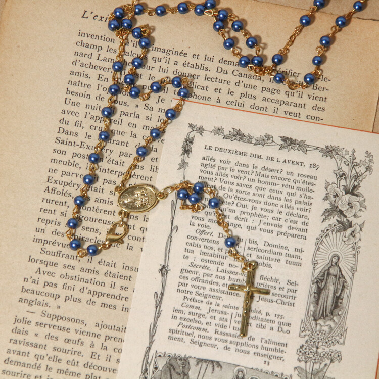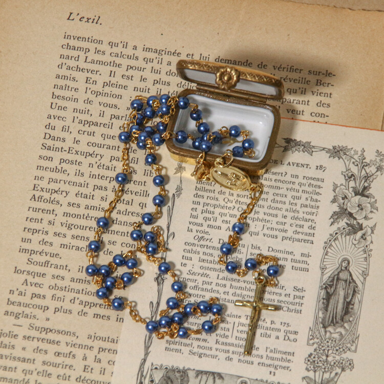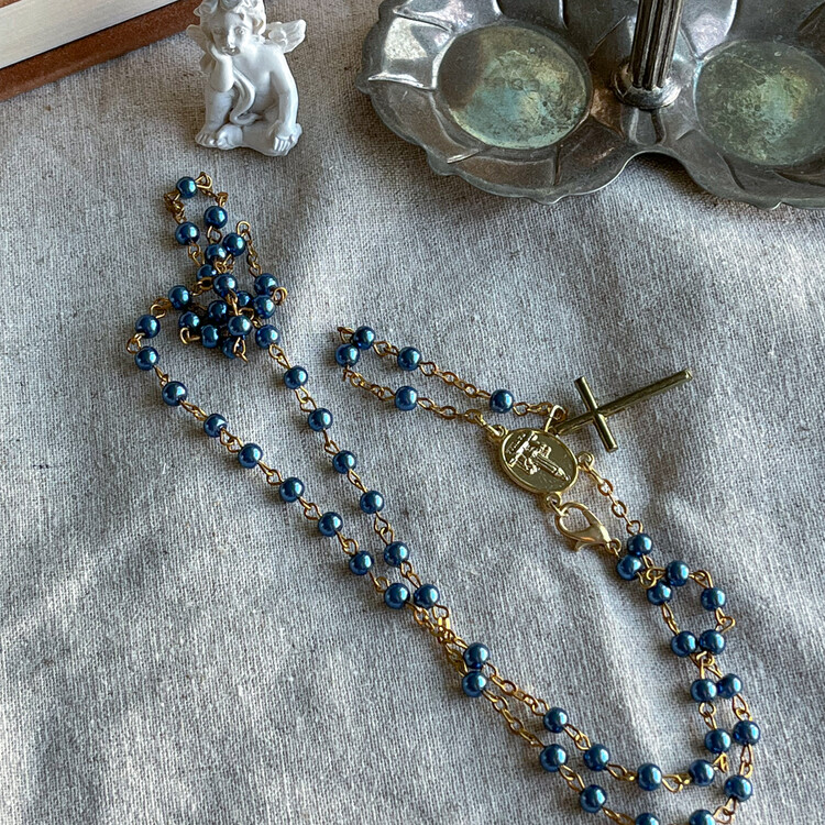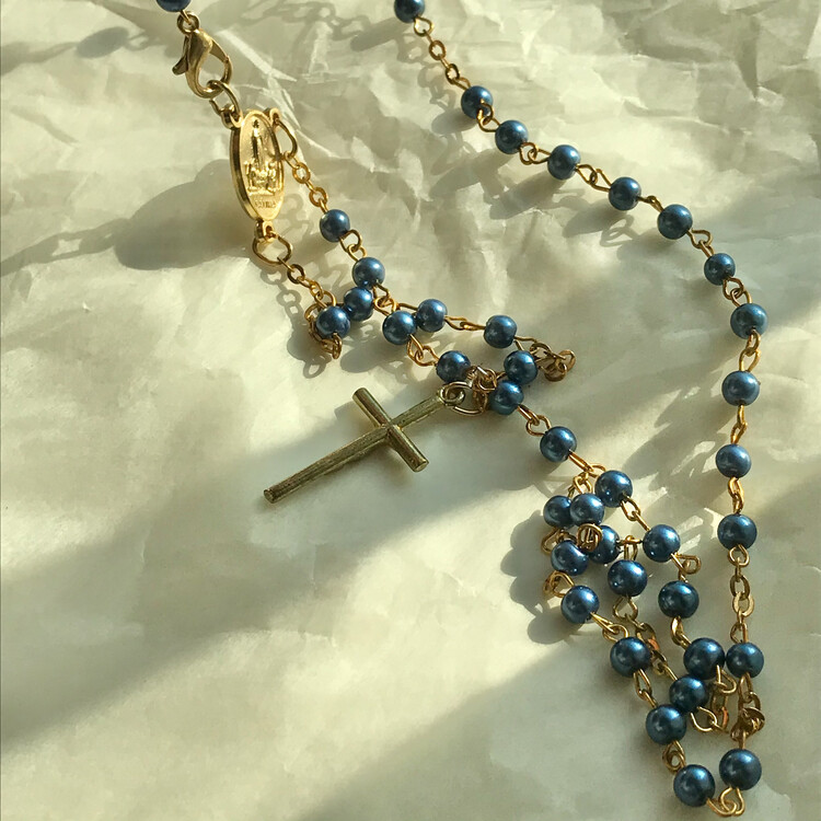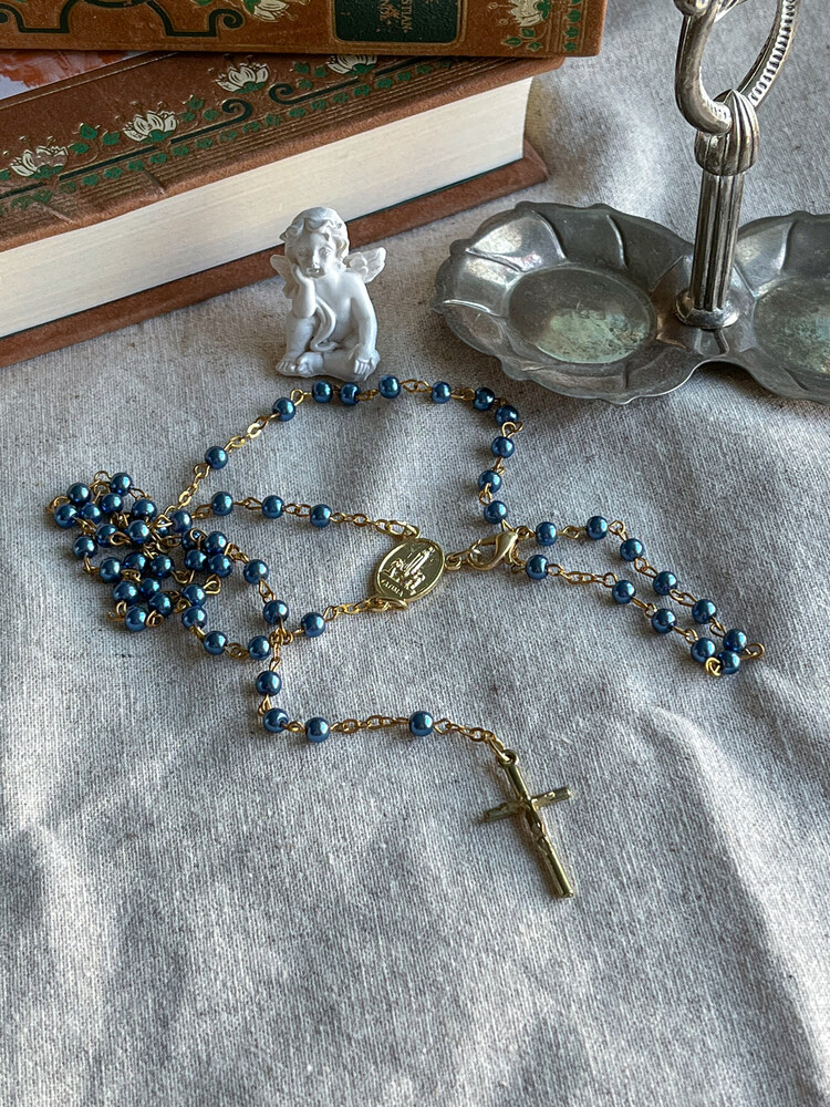 옐로우 골드 체인과 짙은 푸른빛 펄 비즈로 엮인 묵주입니다. 후크로 제작되어 목걸이처럼 착용 가능합니다.