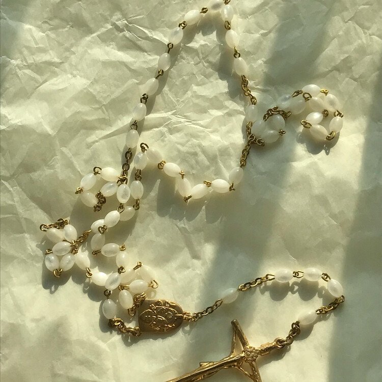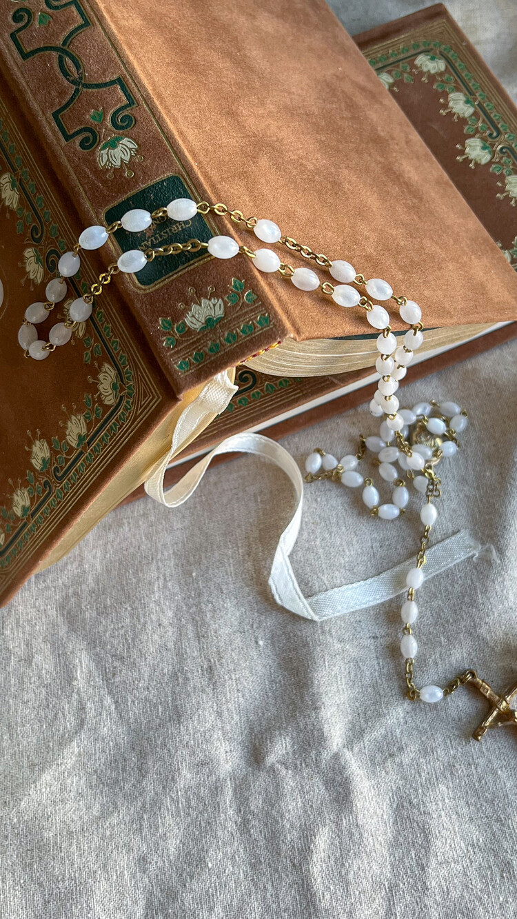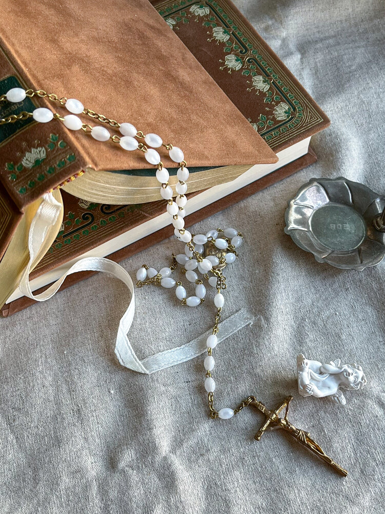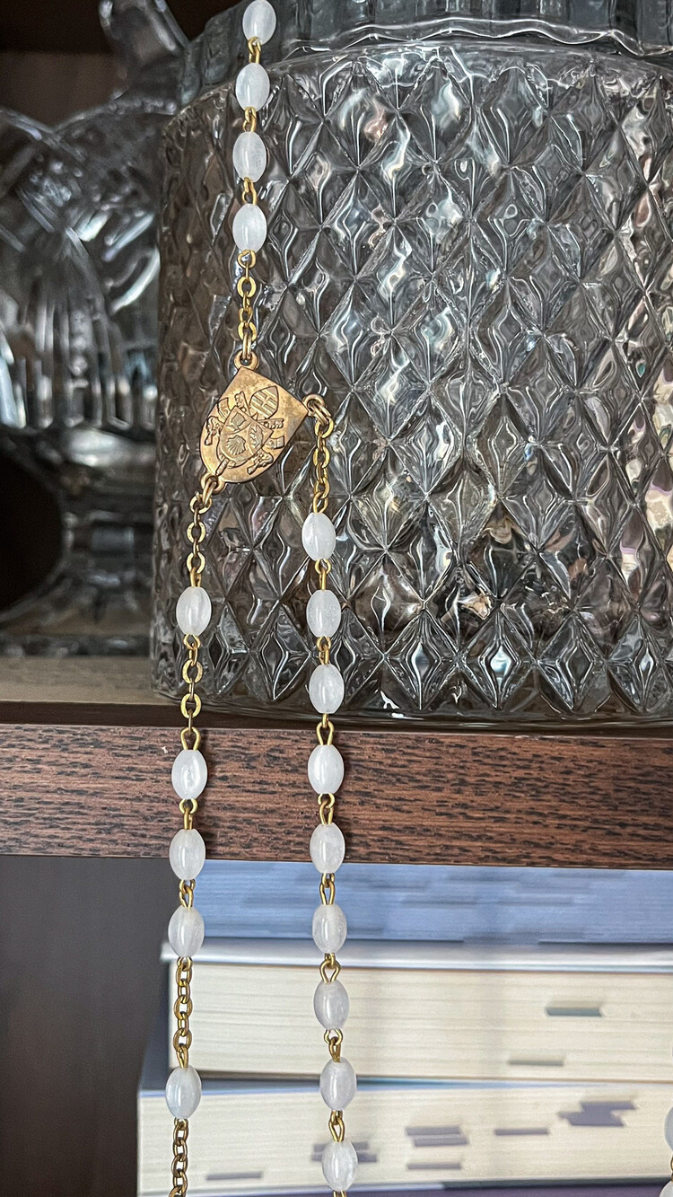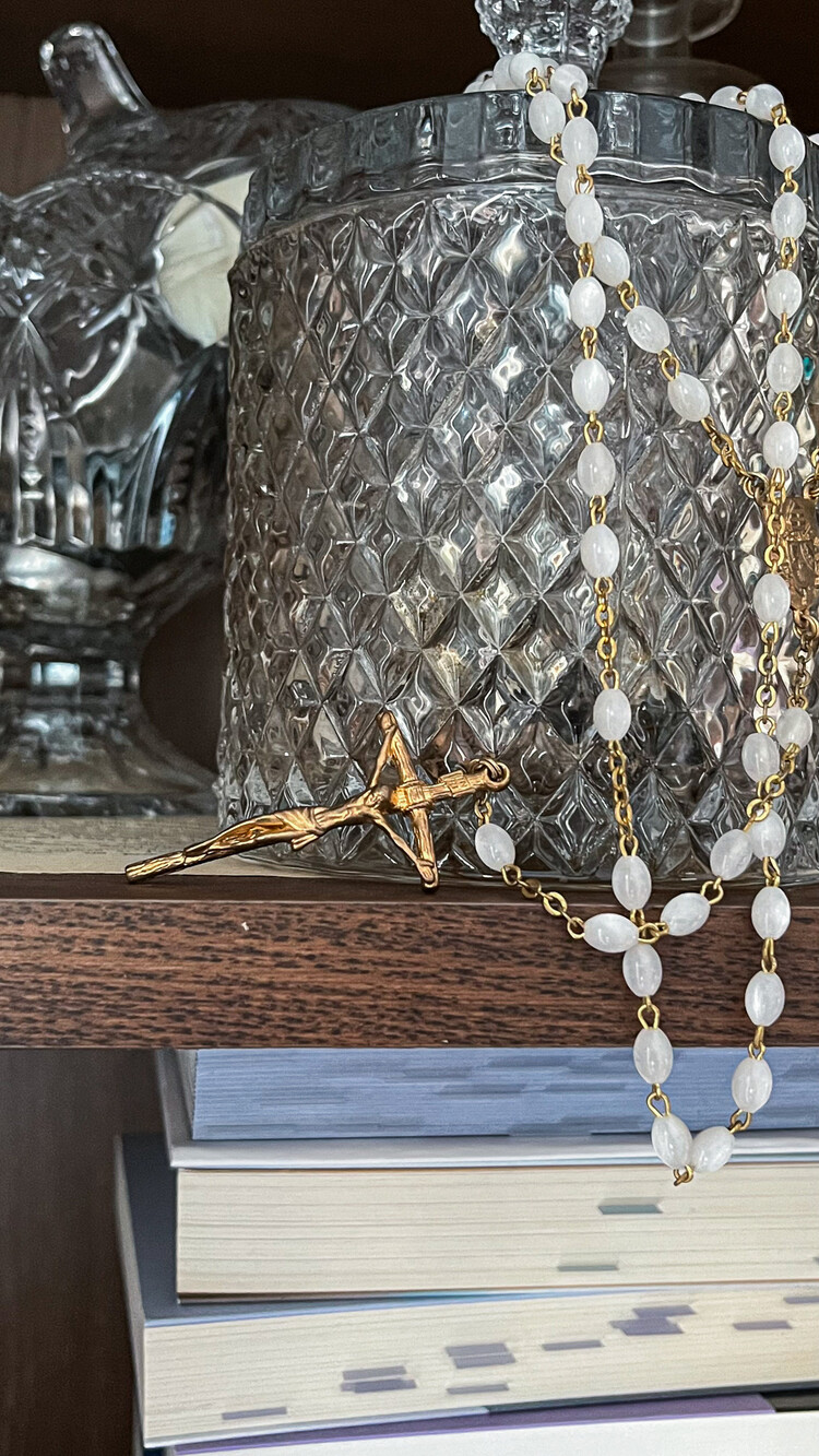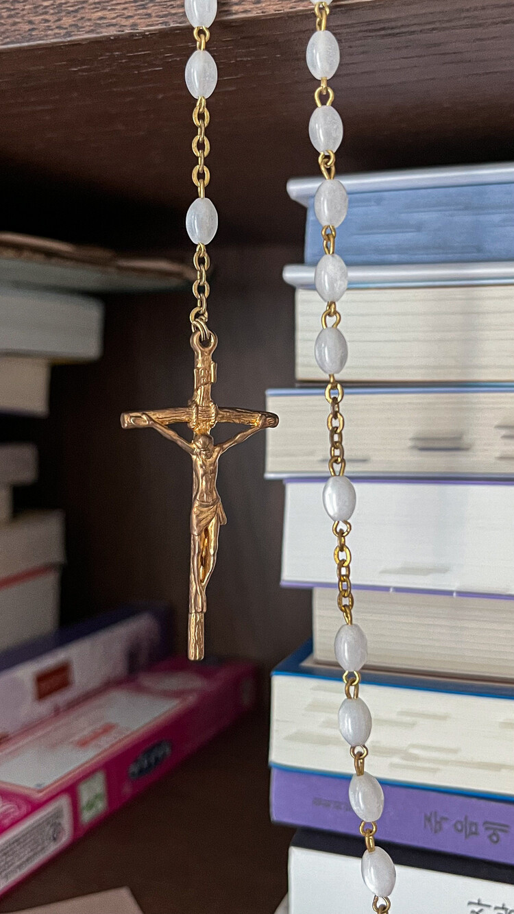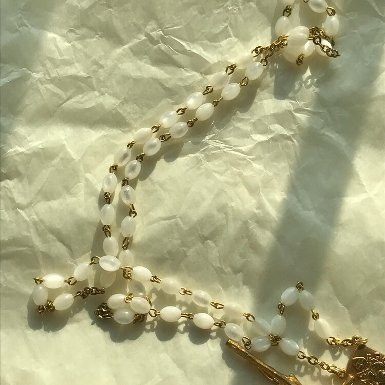 옐로우 골드 체인과 은은하고 맑은 광으로 깨끗한 느낌의 비즈 묵주입니다. 넉넉한 기장감으로 목에 걸쳐 사용 가능합니다.