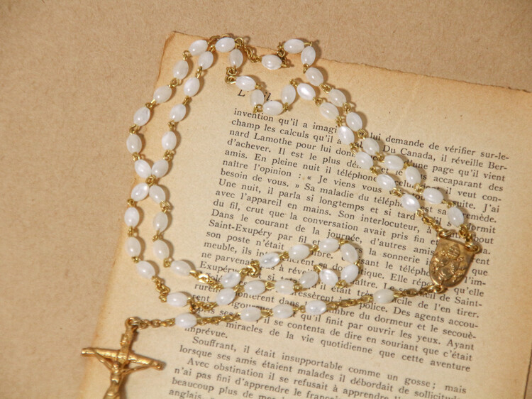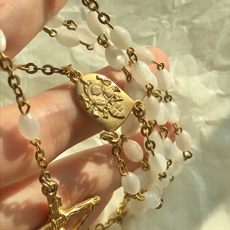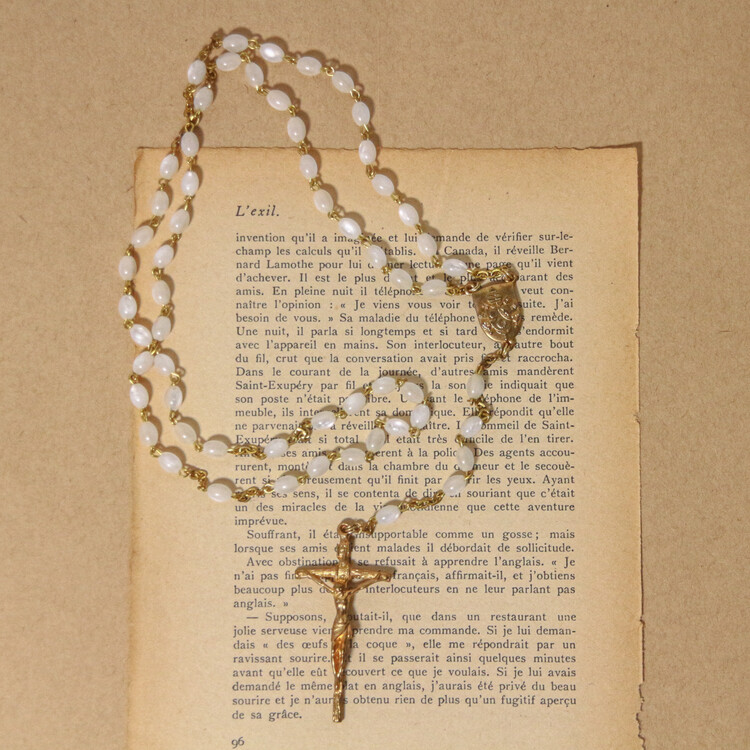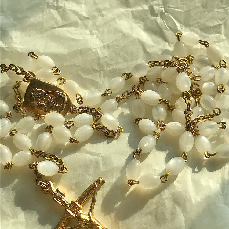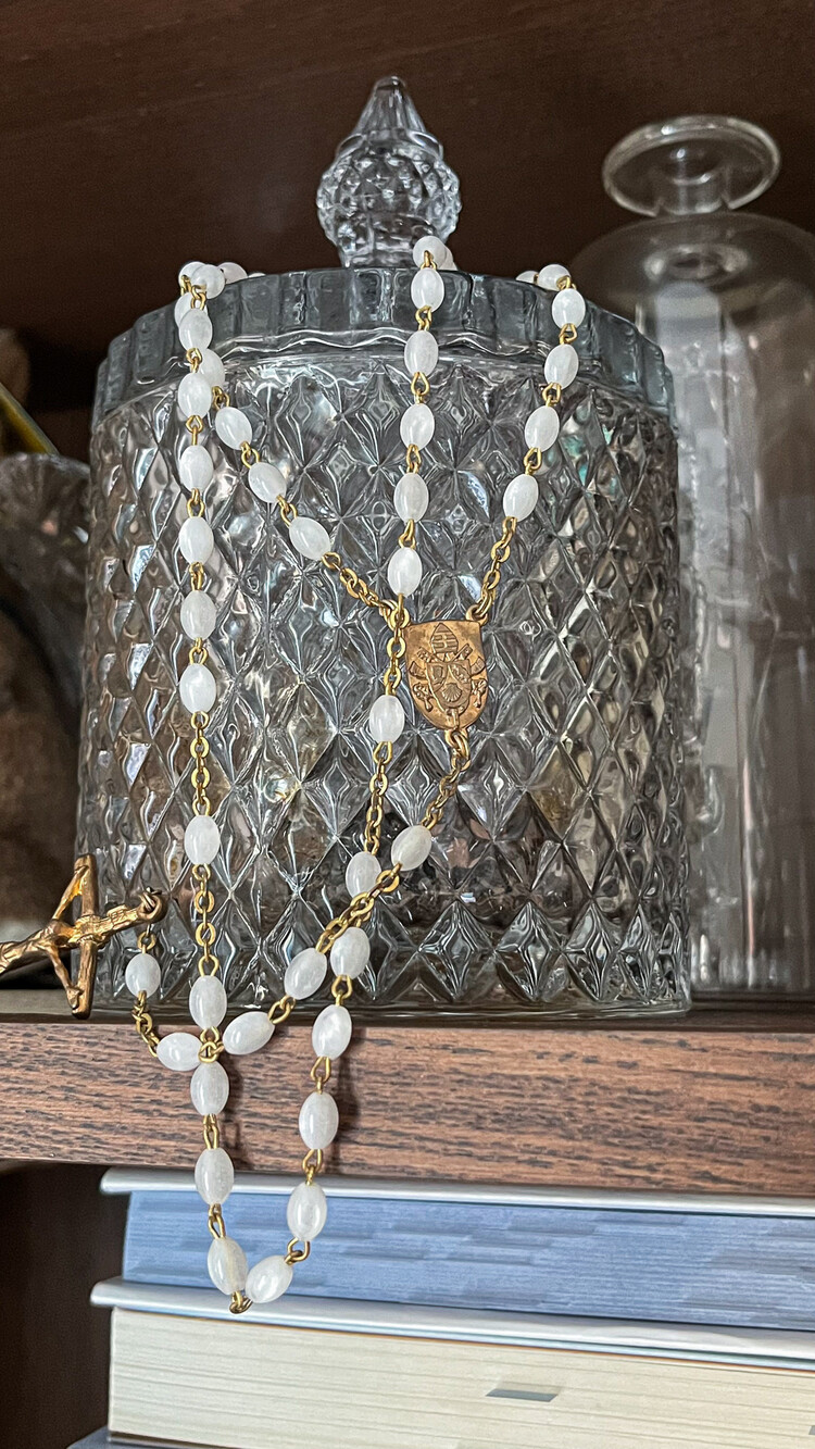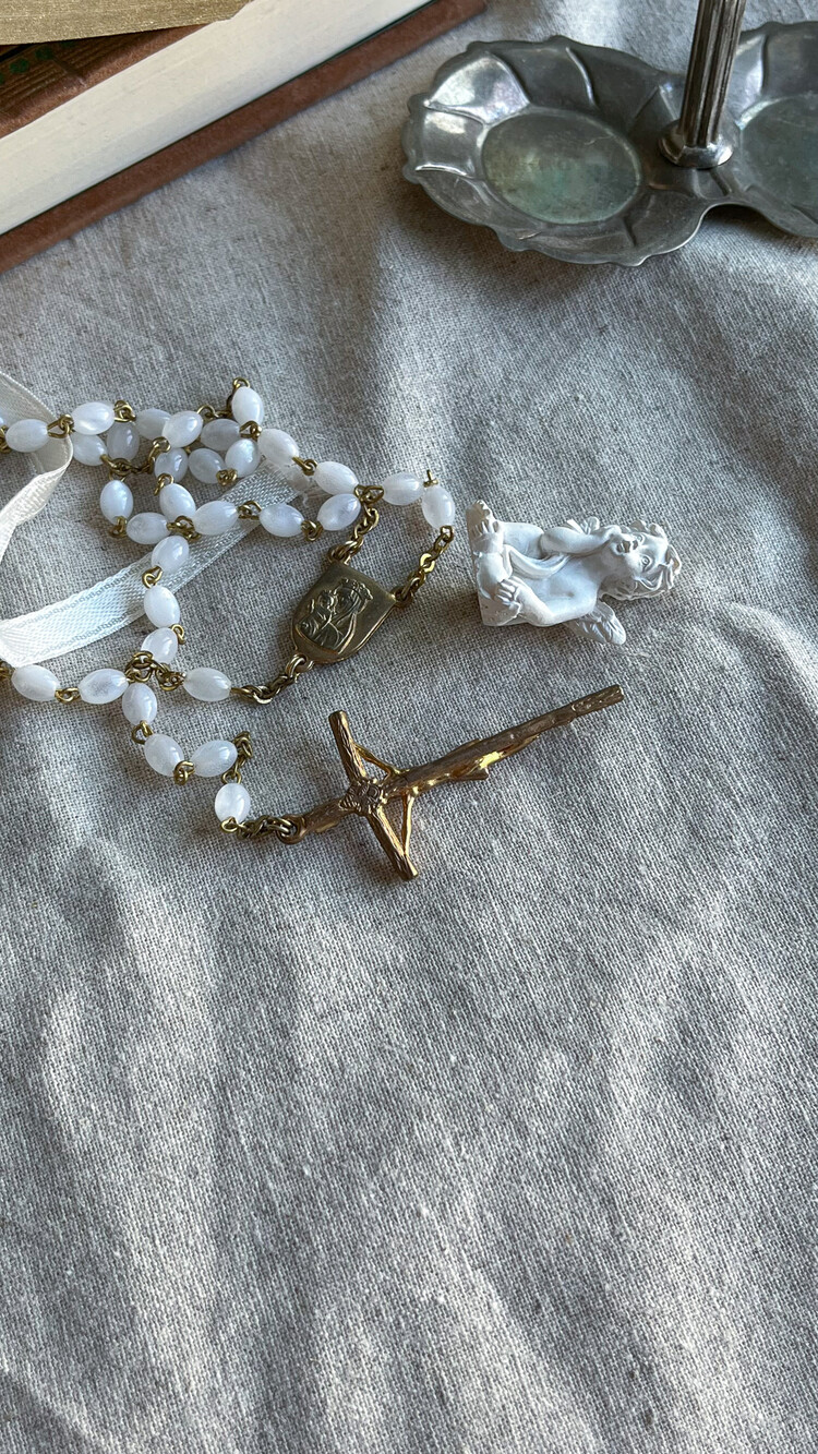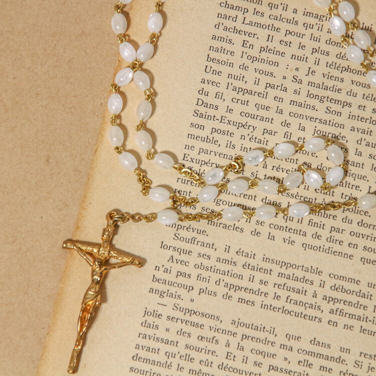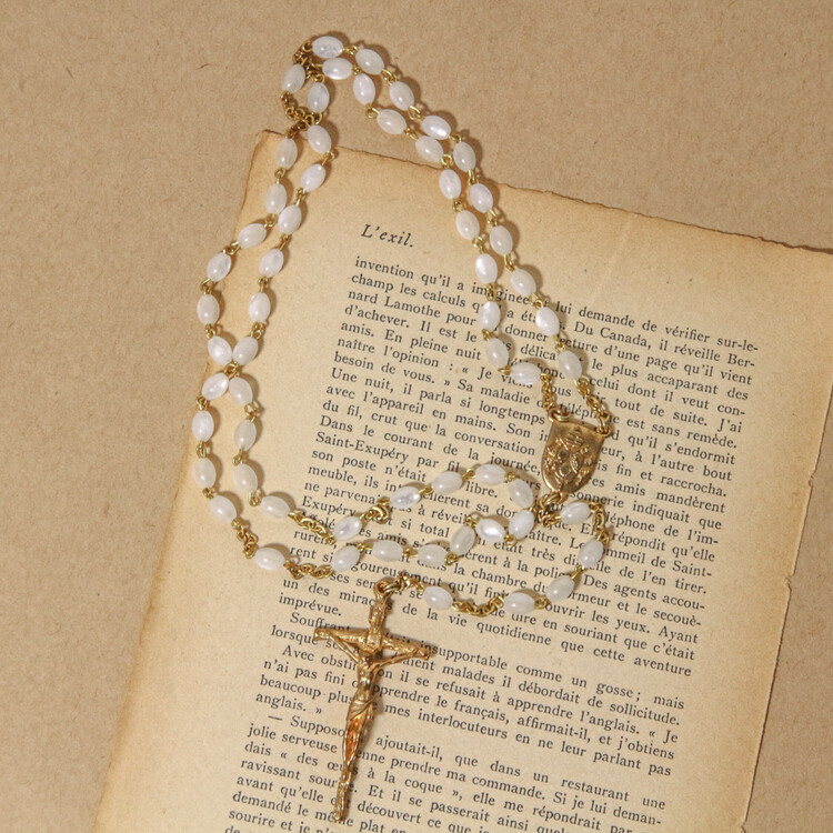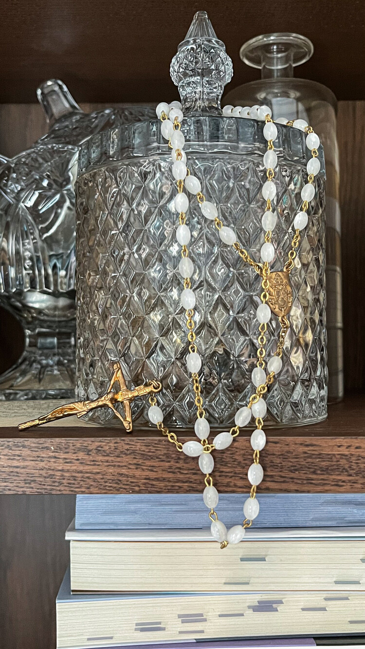 옐로우 골드 체인과 은은하고 맑은 광으로 깨끗한 느낌의 비즈 묵주입니다. 넉넉한 기장감으로 목에 걸쳐 사용 가능합니다.