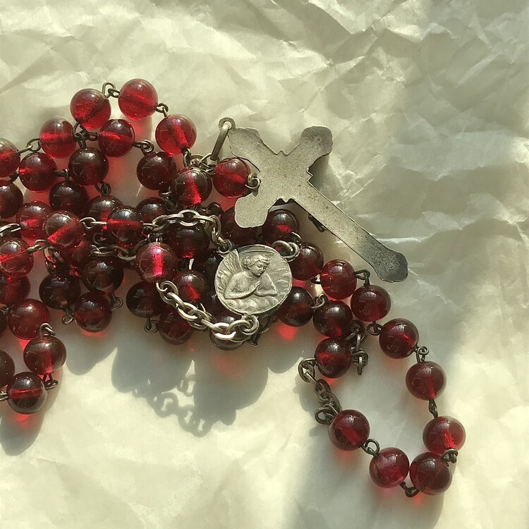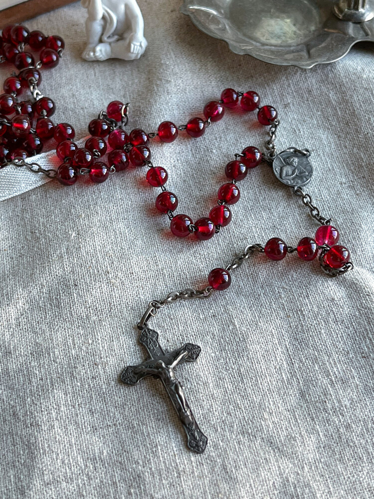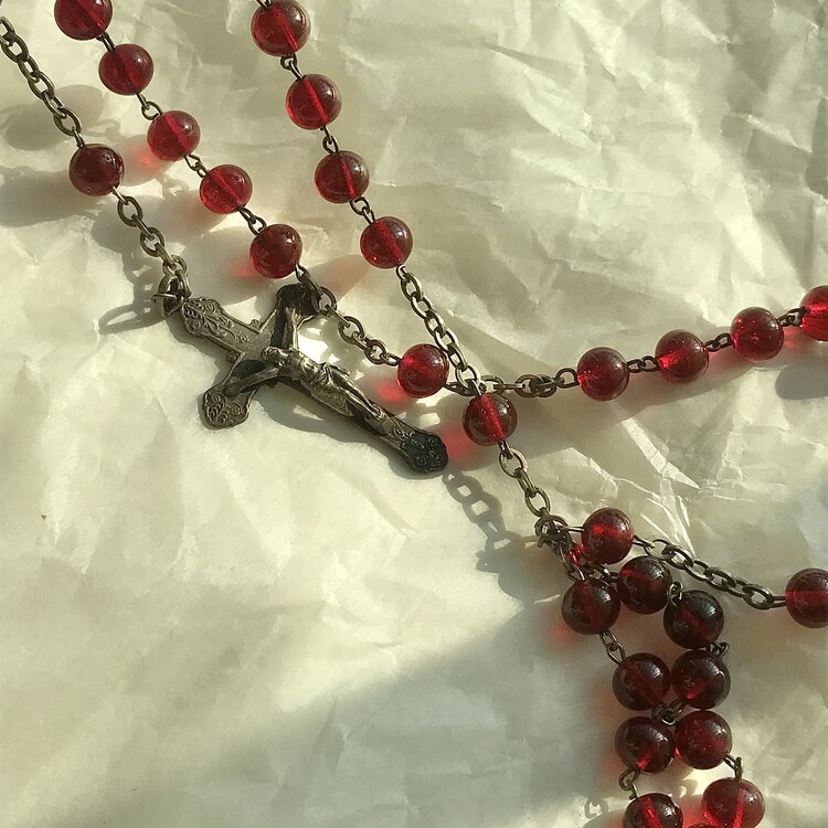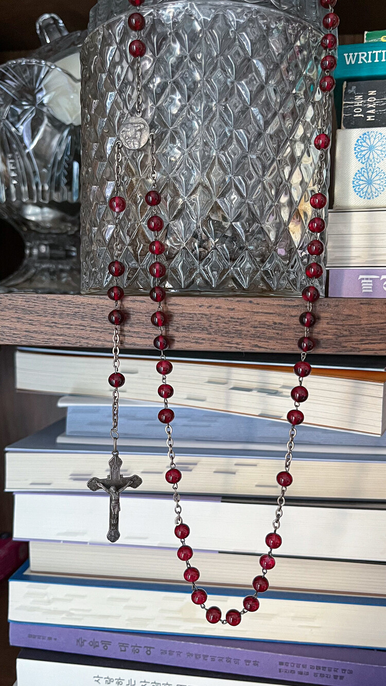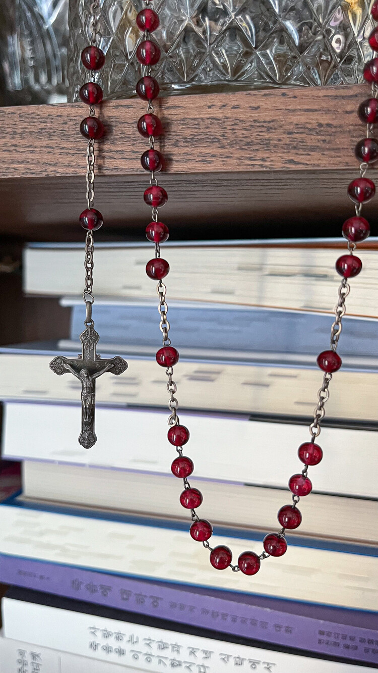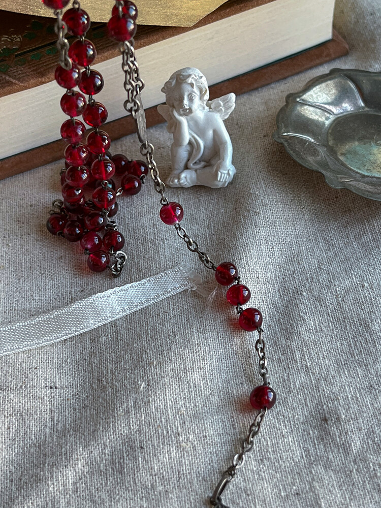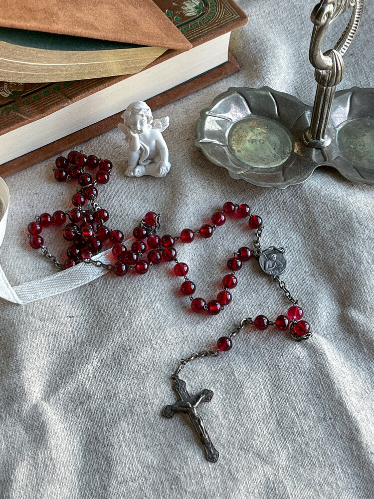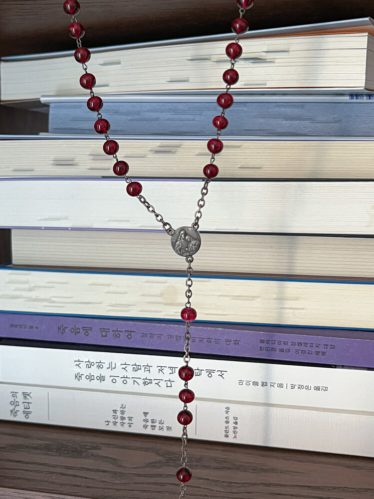 맑은 붉은빛 비즈로 엮인 묵주입니다. 체리 사탕 같은 붉은빛과 에이징된 펜던트가 어우러져 고풍스러운 분위기가 돋보입니다. 전체적으로 무게감 느껴집니다. 목에 걸어 착용 가능한 기장입니다.
