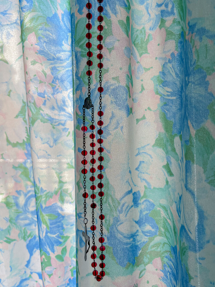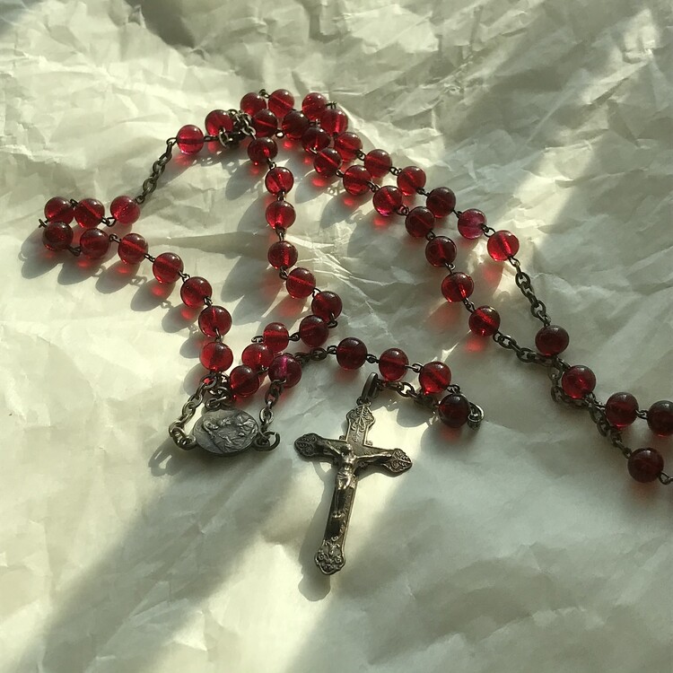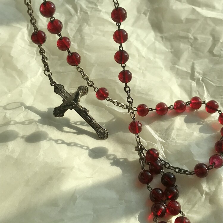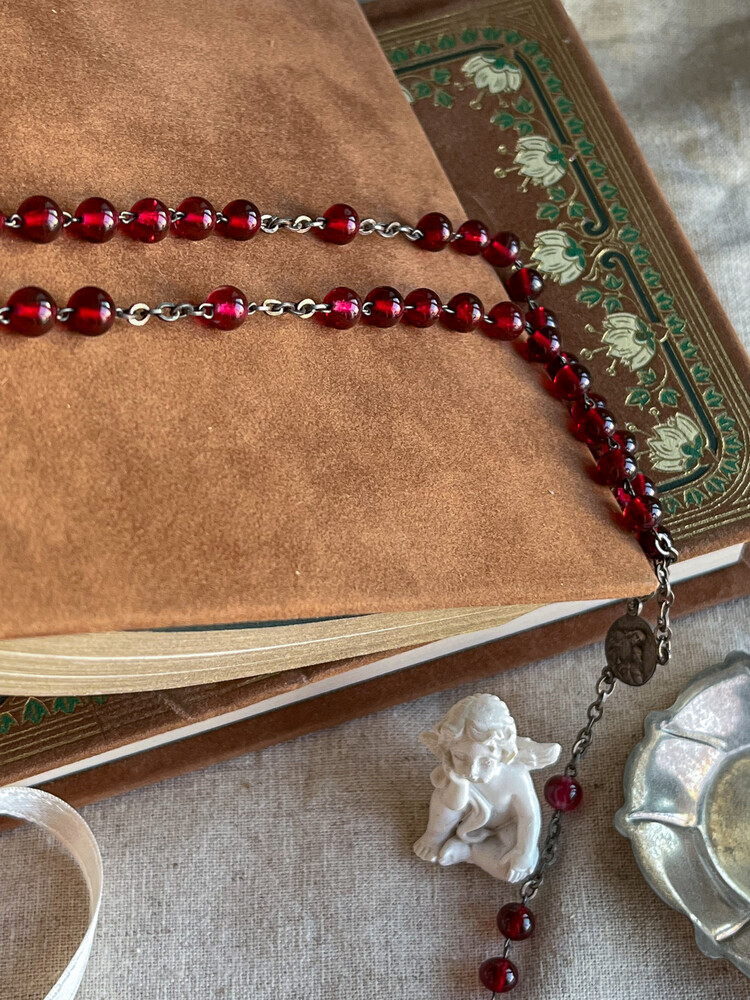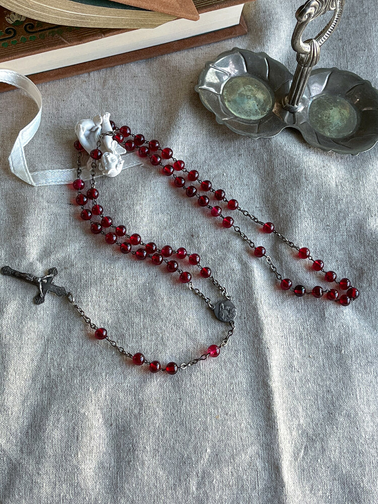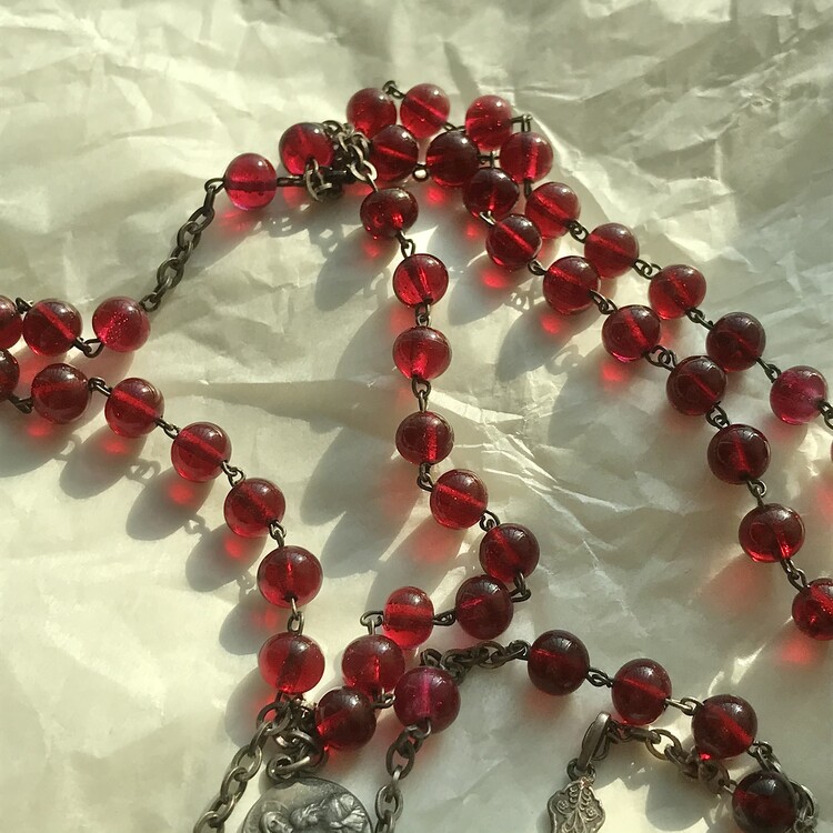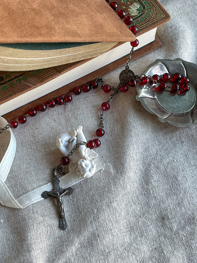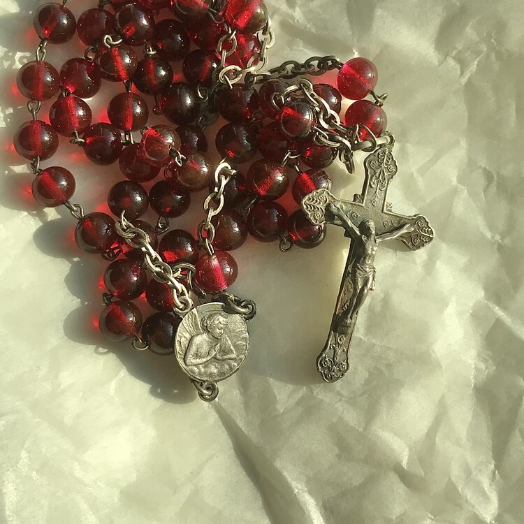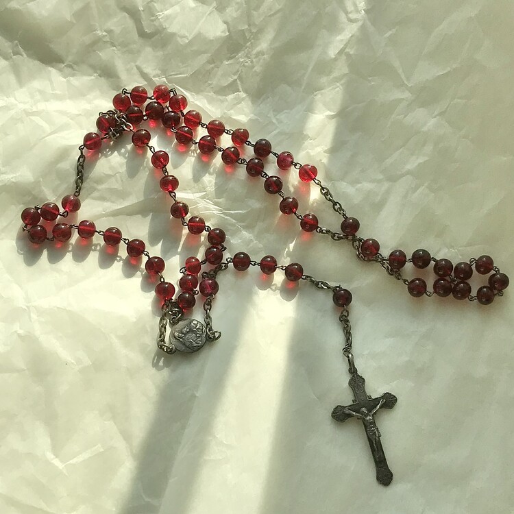 맑은 붉은빛 비즈로 엮인 묵주입니다. 체리 사탕 같은 붉은빛과 에이징된 펜던트가 어우러져 고풍스러운 분위기가 돋보입니다. 전체적으로 무게감 느껴집니다. 목에 걸어 착용 가능한 기장입니다.